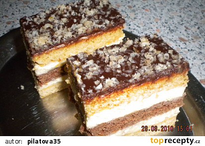 Světlou placku potřeme polovinou krému, přiklopíme tmavou plackou a celé opakujeme. Nakonec řezy polijeme čokoládovou polevou a posypeme ořechy - nastrouhanými, nebo nasekanými nadrobno.