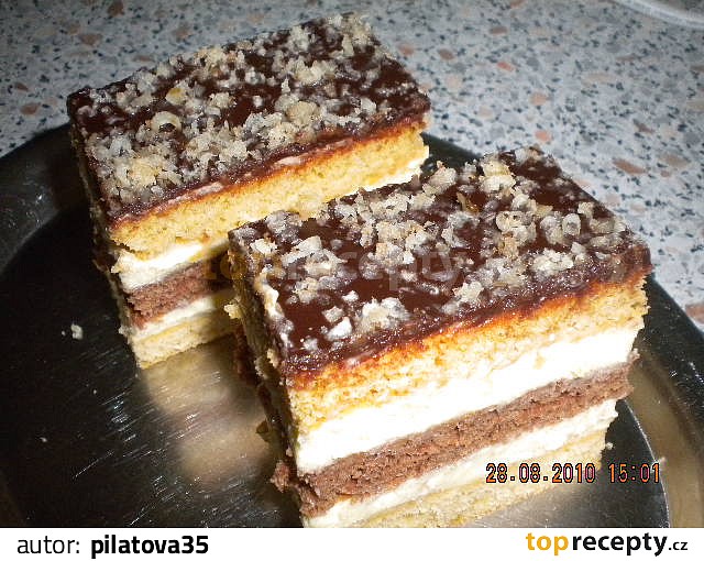 Světlou placku potřeme polovinou krému, přiklopíme tmavou plackou a celé opakujeme. Nakonec řezy polijeme čokoládovou polevou a posypeme ořechy - nastrouhanými, nebo nasekanými nadrobno.